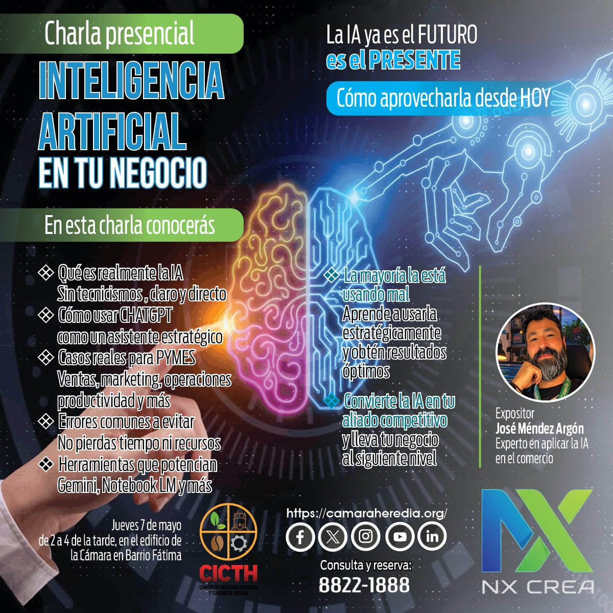 🚀 Estimados afiliados y empresarios, la Cámara de Industria, Comercio y Turismo de Heredia les invita a participar en la charla presencial “Inteligencia Artificial en tu Negocio”.